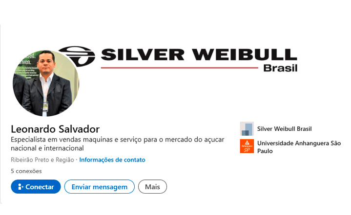 Acesse o perfil da Silver Weibull Brasil no LinkedIn e fique por dentro de lançamentos, cases, vagas e atualizações técnicas sobre soluções para a indústria do açúcar. Conecte-se com nossa equipe e acompanhe conteúdos relevantes do setor.